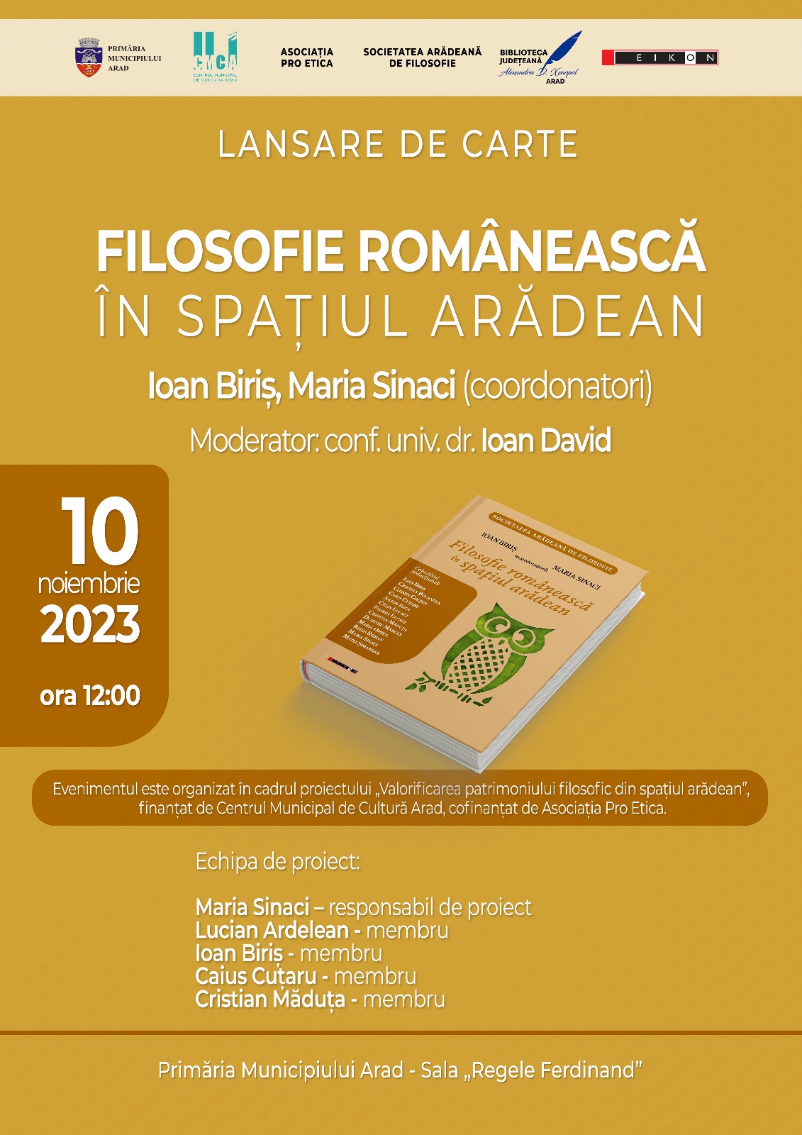 ARAD. Proaspăt publicat la Editura EIKON din București sub coordonarea universitarilor Ioan Biriș și Maria Sinaci, volumul Filosofie românească în spaţiul arădean va fi lansat vineri, 10 noiembrie 2023, ora 12.00, în Sala Ferdinand a Primăriei Municipiului Arad.