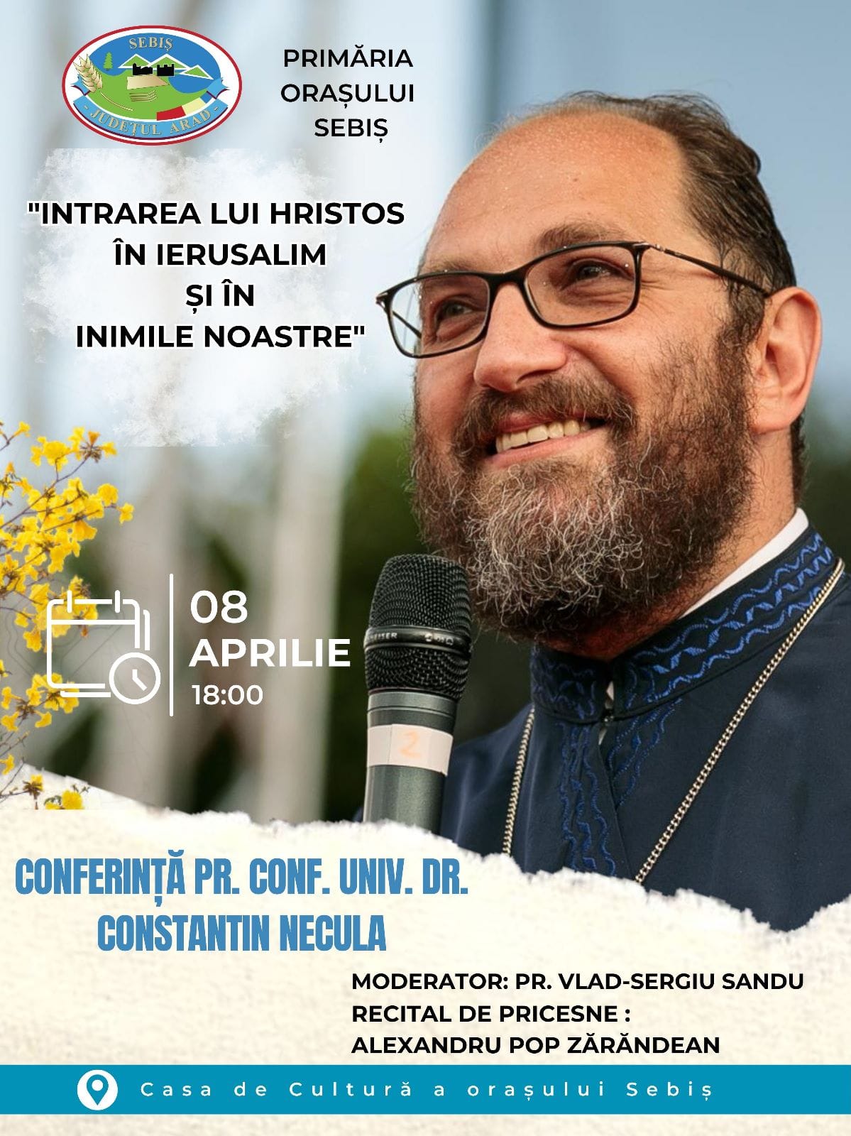 Evenimentul va avea loc pe 8 aprilie, începând de la ora 18.00, la Casa de Cultură a Oraşului Sebiş. Potrivit primarului Cristian Feieş, intrarea este liberă. Evenimentul va fi moderat de către pr. Vlad-Sergiu Sandu, din program făcând parte şi un recital de pricesne susţinut de Alexandru Pop Zărăndean.