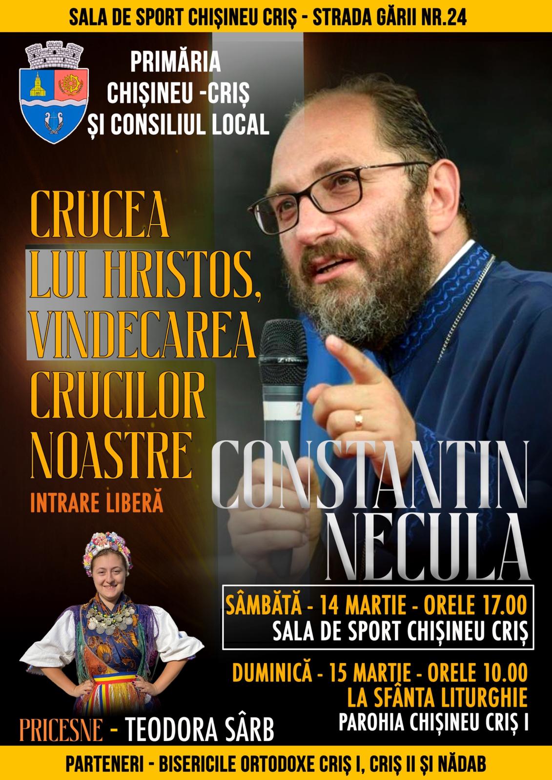 ARAD. Comunitatea ortodoxă din Chișineu-Criș se pregătește să găzduiască un eveniment spiritual deosebit. Părintele Constantin Necula, unul dintre cei mai cunoscuți teologi și conferențiari ortodocși din România, va susține sâmbătă, 14 martie 2026, o conferință dedicată sensului suferinței și puterii vindecătoare a credinței. Evenimentul este organizat de Primăria și Consiliul Local Chișineu-Criș, în parteneriat cu Bisericile Ortodoxe Criș I, Criș II și Nădab.