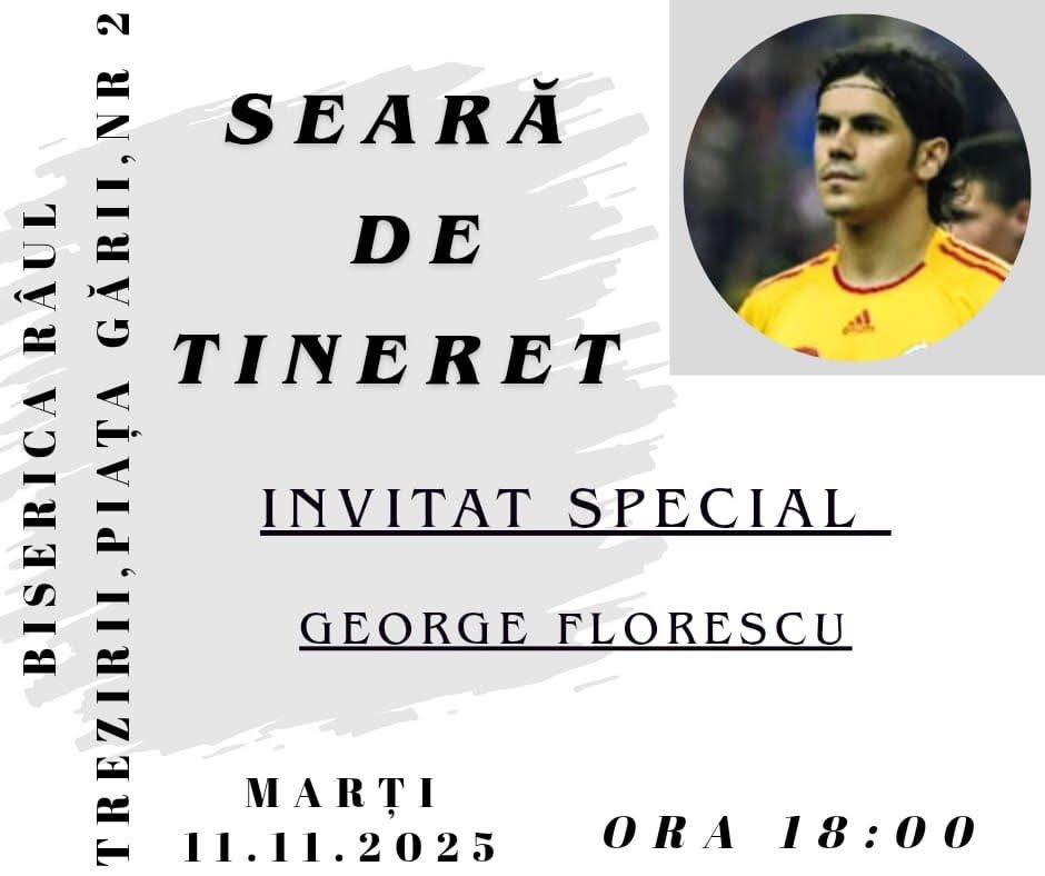 „Biserica Creștină Râul Trezirii Arad îi invită pe toți tinerii la o seară deosebită de tineret, la sediul din Piața Gării nr.2 Arad. Vom asculta mărturia invitatului nostru special, George Florescu, un fotbalist român care joacă pe post de mijlocaș la Cluj. Pe plan internațional, are 10 prezențe la națională pentru România”, au transmis organizatorii.