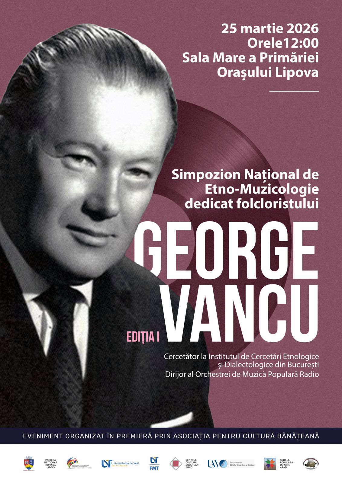 LIPOVA. Asociația pentru Cultură Bănățeană organizează, în premieră, în parteneriat cu Primăria Orașului Lipova și Parohia Ortodoxă Română din Lipova, pe 25 martie 2026, prima ediție a Simpozionului Național De Etnomuzicologie dedicat folcloristului George Vancu (1919 – 1992).
