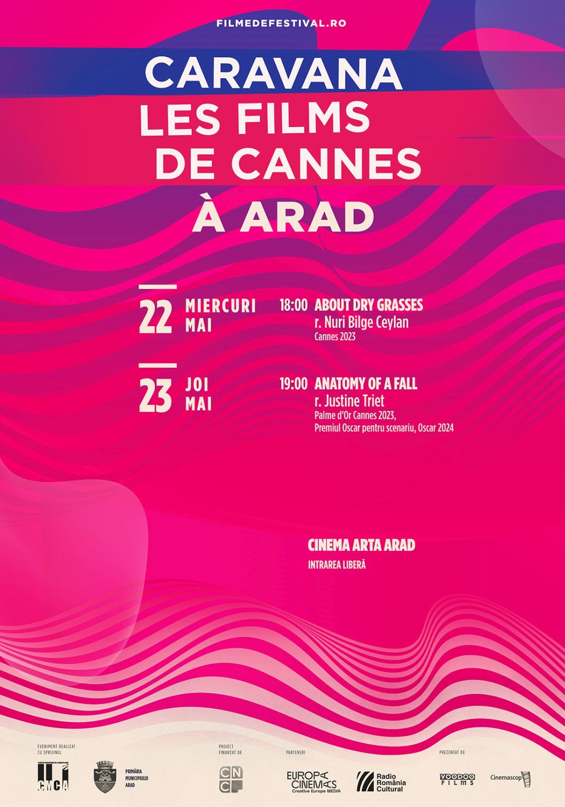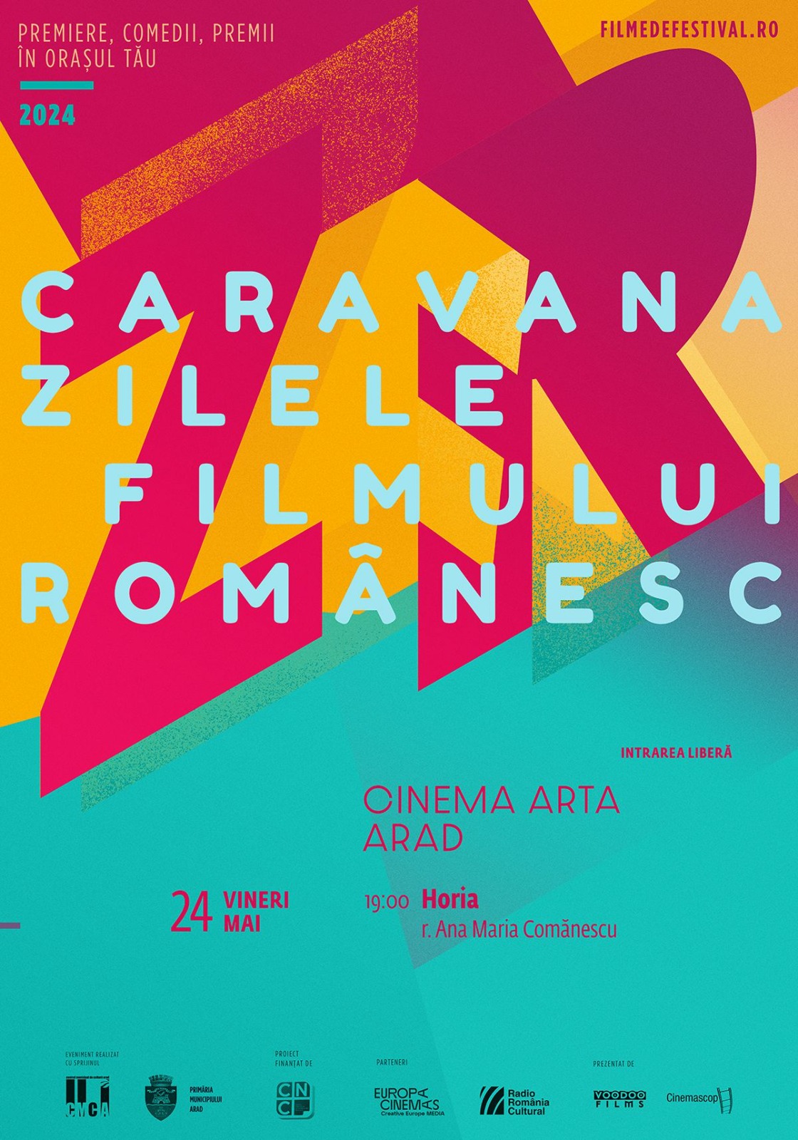 Proiecțiile vor avea loc în cadrul proiectului „Caravana filmelor la Arad, ediția 2024“, finațat de Centrul Municipal de Cultură, în cadrul programului „Proiecte de tineret, învățământ și recreative”, sesiunea I.