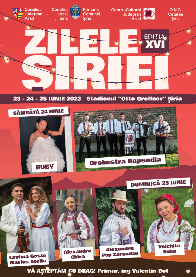 Primarul comunei Șiria și Consiliul Local Șiria, în calitate de organizatori alături de Consiliul Județean Arad, Centrul Cultural Județean Arad și ONG Cetatea Șiriei organizează „Zilele Șiriei”, ediția a XVI-a, pe Stadionul „Otto Greffner” din localitate. În cadrul evenimentelor culturale se numără: Sărbătoarea Iei, ediția a IV-a, Concursul Național de Interpretare a Muzicii Vocale Românești „Emil Monția”, ediția a III-a, Festivalul Cântecului și Jocului Popular în Podgoria Aradului, ediția a XIII-a .