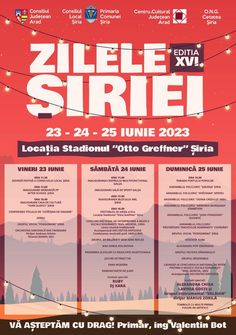 ora 19.00 – inaugurare Casa de Cultură „Ioan Slavici” Șiria; Conferirea titlului de „Cetățean de onoare”; Dineu; Grupul vocal „Podgorenii” Șiria; Orchestra simfonică din Timișoara – dirijor: Andreas Schein, tenorul Daniel Zah.