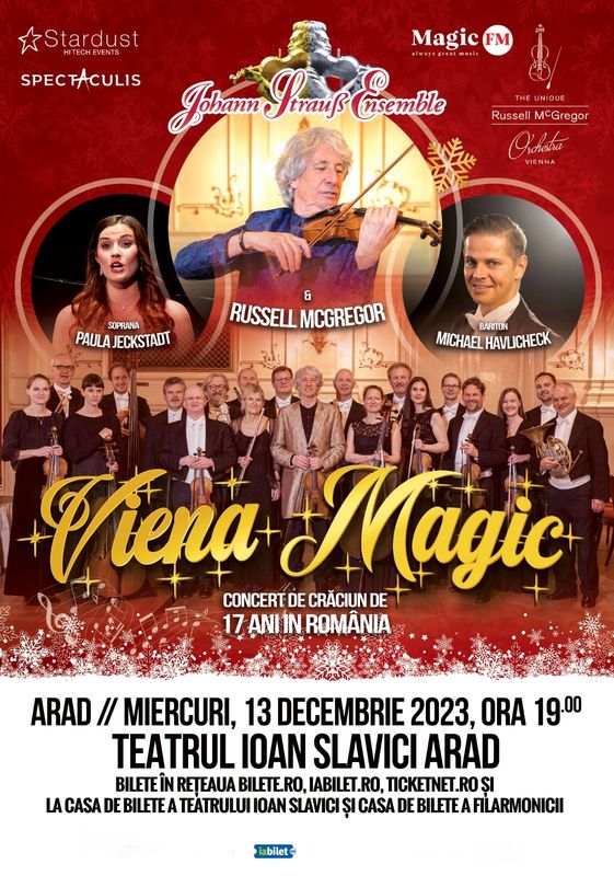 ARAD. Cu o tradiție de peste 17 ani, cel mai așteptat concert al anului dedicat sărbătorilor de iarnă, susținut de muzicienii desăvârșiți ai orchestrei Johann Strauss Ensemble sub bagheta maestrului dirijor Russell McGregor, va fi prezentat la Arad, alături de doi invitați speciali, soprana Paula Jeckstadt și baritonul Michael Havlicheck, în cadrul turneului național „Viena Magic”.