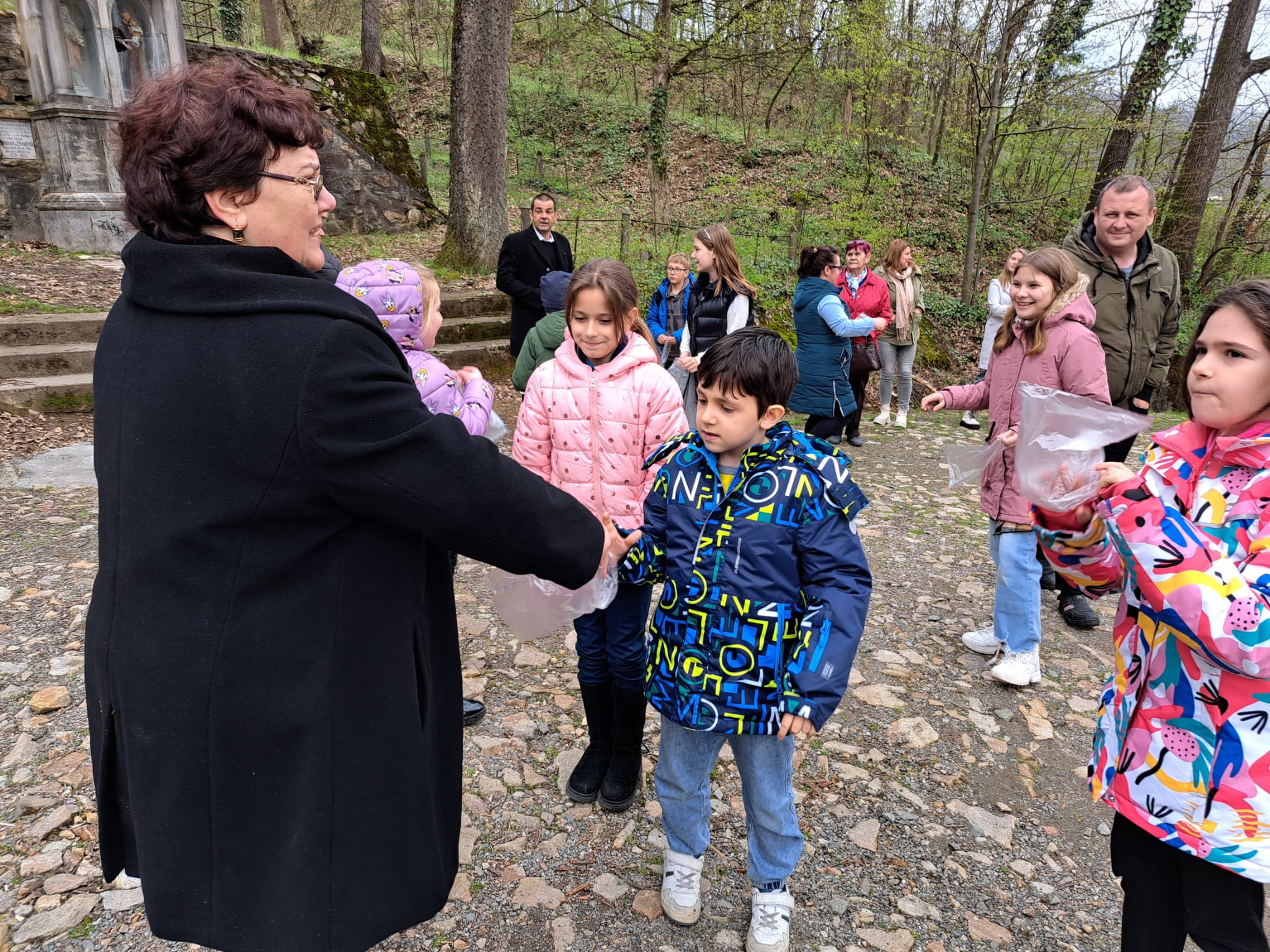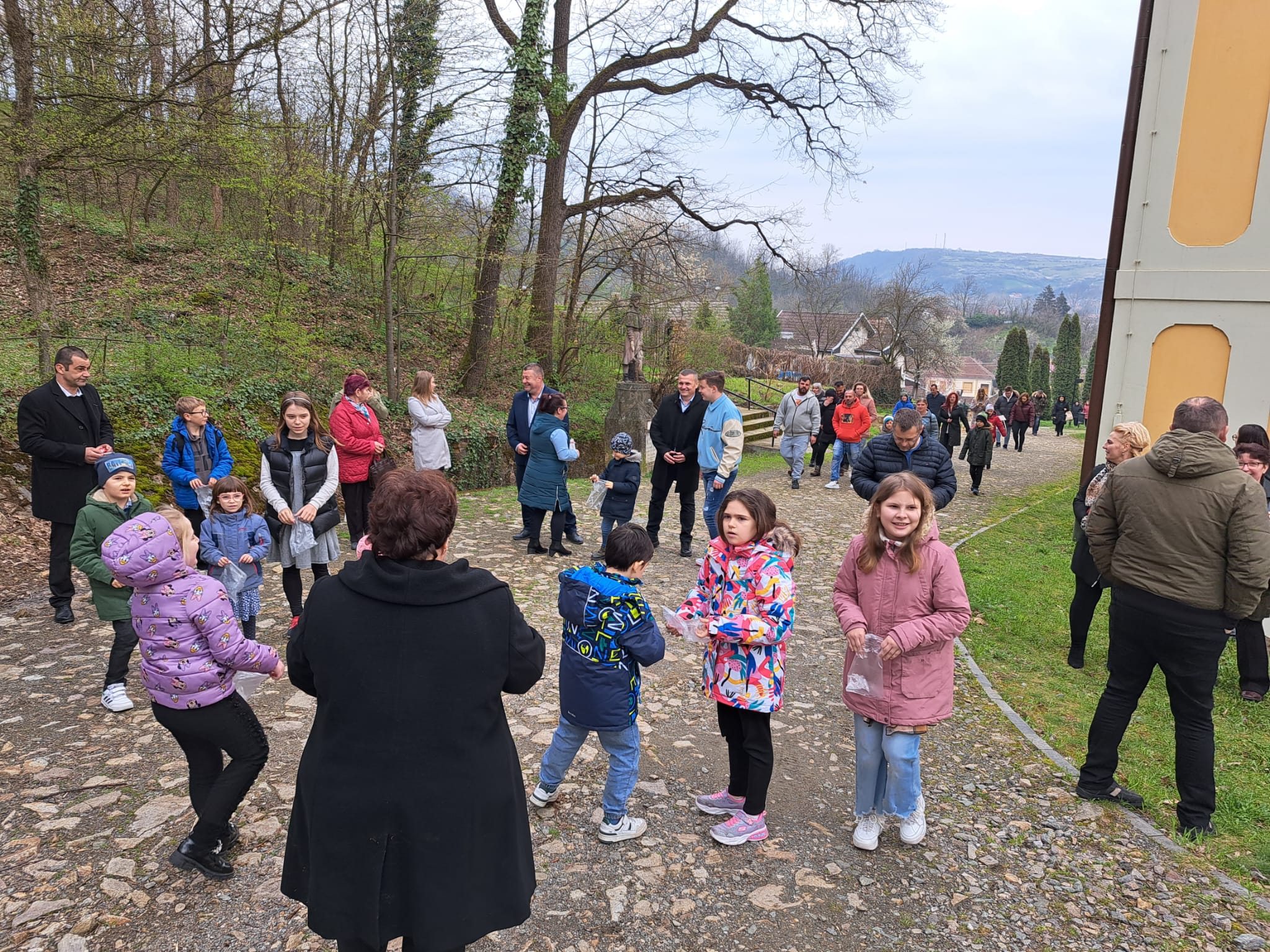 După Sfânta Liturghie a avut loc și un moment aparte, dedicat celor mai mici vizitatori ai bisericii: vânătoarea de ouă. În parcul de pe dealul din spatele mănăstirii au fost ascunse o sută de ouă de Paște, copiii fiind provocați de preotul paroh să le găsească.