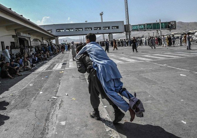 Un voluntar transportă un rănit între timp ce alte persoane pot fi văzute așteptând pe aeroportul din Kabul/FOTO: AFP