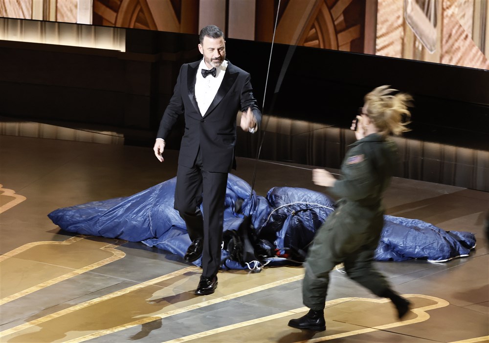 Jimmy Kimmel, care a prezentat gala Oscar pentru a treia oară, a întreţinut o atmosferă degajată. Celebrul prezentator TV american a coborât pe scena de la Dolby Theatre din Los Angeles cu ajutorul unei paraşute – trimitere evidentă la filmul „Top Gun: Maverick”, căruia i-a mulţumit pentru că a salvat industria de la Hollywood în vara anului trecut, făcându-i pe spectatori să revină în cinematografe după perioada dificilă cauzată de pandemia de coronavirus. În semn de omagiu adus aceluiaşi film, două avioane de vânătoare au survolat la mică înălţime clădirea în care s-a desfăşurat evenimentul, cu puţin timp înainte de începerea acestuia.