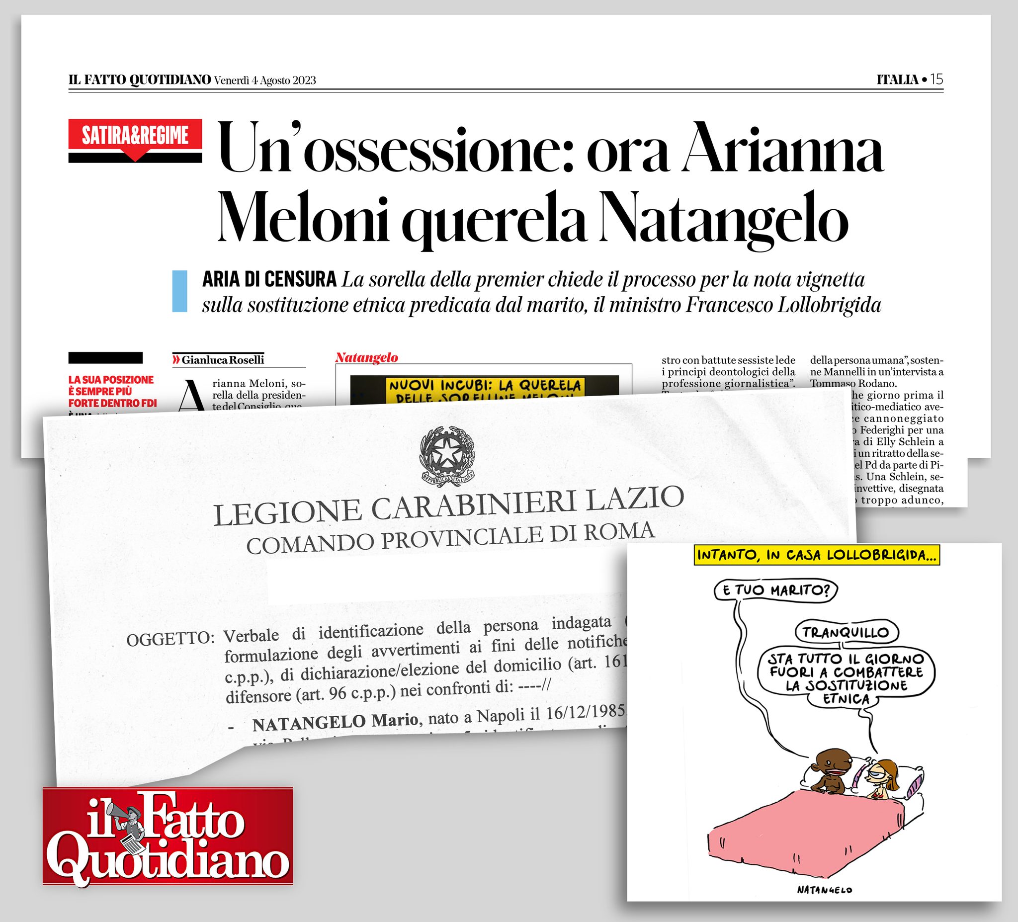 Arianna Meloni, despre care presa italiană afirmă că ar putea să participe la următoarele alegeri pentru Parlamentul European pe lista partidului Fratelli d’Italia, a depus plângere împotriva lui Mario Natangelo, caricaturist al publicaţiei Il Fatto Quotidiano, care a adoptat un ton foarte critic la adresa Guvernului italian.