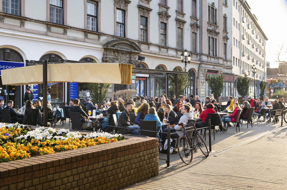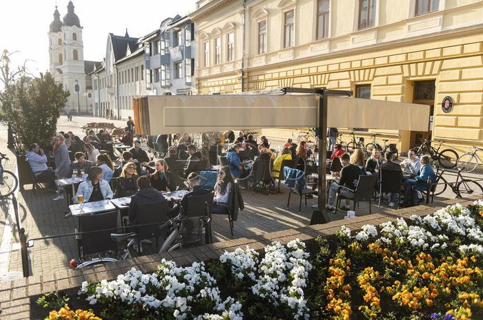 epa09157294 Guests sit on a terrace of a restaurant in Nyiregyhaza, Hungary, 24 April 2021. Hungarians had their first taste of normality in nearly six months today as the outdoor terraces of restaurants and bars reopened marking the newest round of openings in the country. EPA-EFE/Attila Balazs HUNGARY OUT