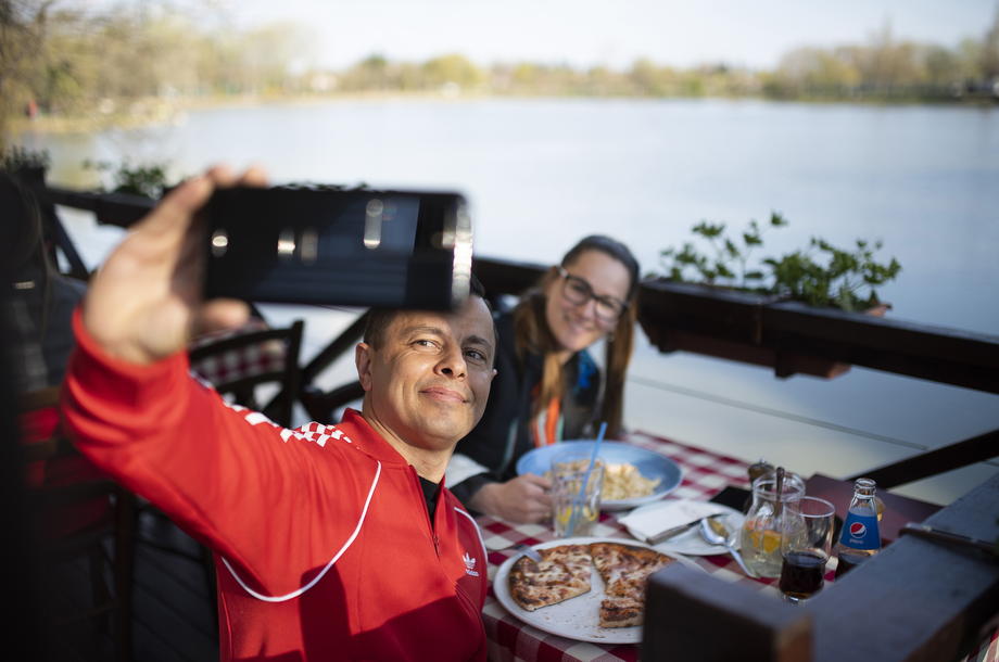 epa09157298 A couple makes a selfie on a terrace of a restaurant in Nyiregyhaza, Hungary, 24 April 2021. Hungarians had their first taste of normality in nearly six months today as the outdoor terraces of restaurants and bars reopened marking the newest round of openings in the country. EPA-EFE/Attila Balazs HUNGARY OUT