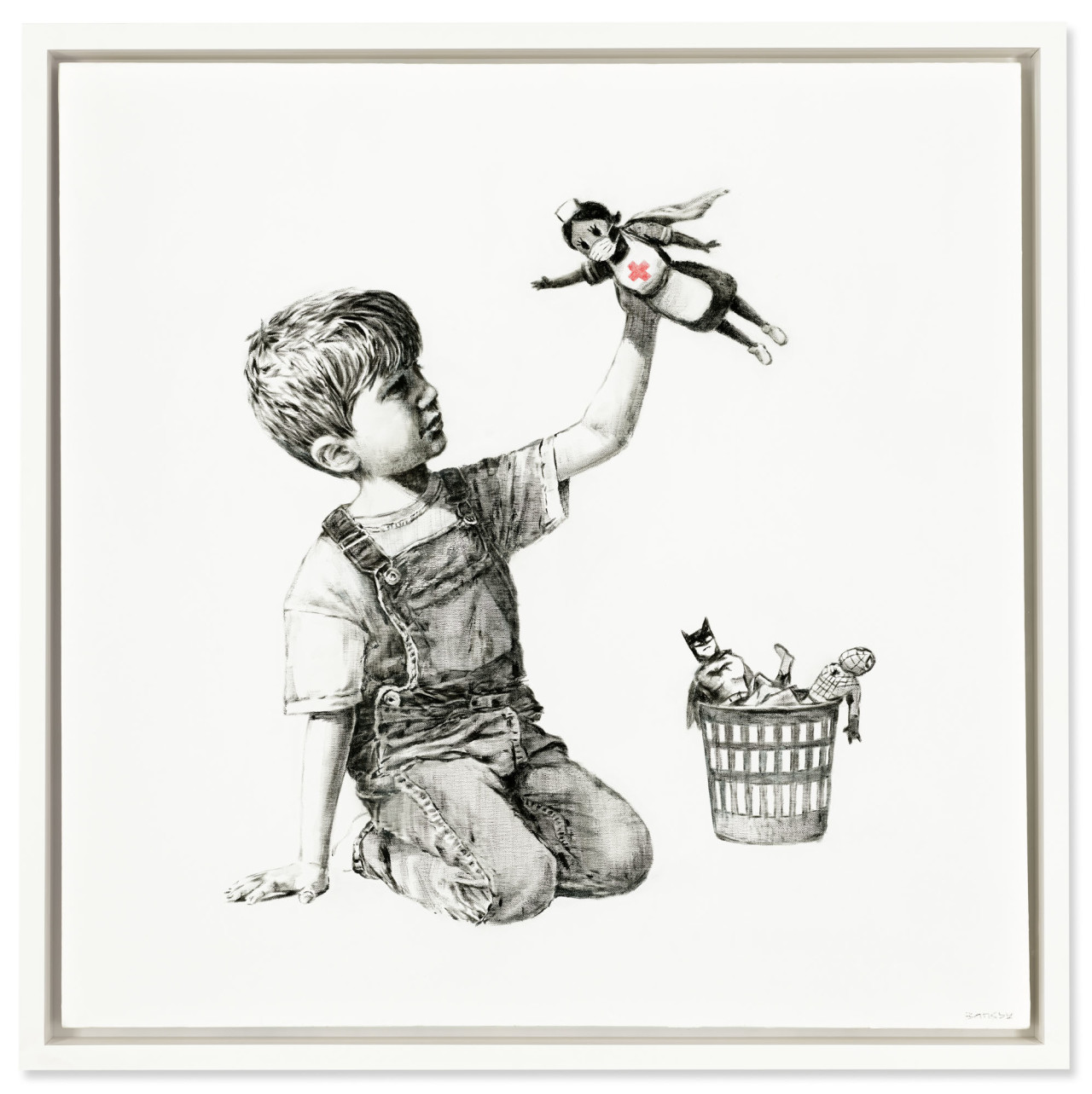 Opera de artă alb-negru prezintă un băieţel care ridică în aer o jucărie reprezentând o asistentă medicală, cu braţul întins şi cu pelerină, în timp ce supereroii tradiţionali Batman şi Spiderman zac într-un coş de gunoi.