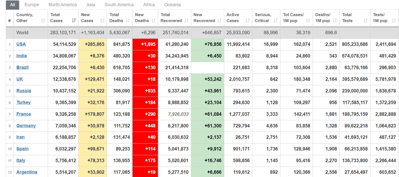 Probleme privind noile infectări înregistrează și SUA, cu 285.863 cazuri raportate în ultimele 24 de ore, dar și UK (Regatul Unit al Marii Britanii), care raportează aproape 130.000 infectări noi (129.471). Spania a raportat aproape 100.000 infectări în ultimele 24 de ore (99.671), în timp ce Turcia a declarat 32.176 infectări, iar Rusia, 21.992.