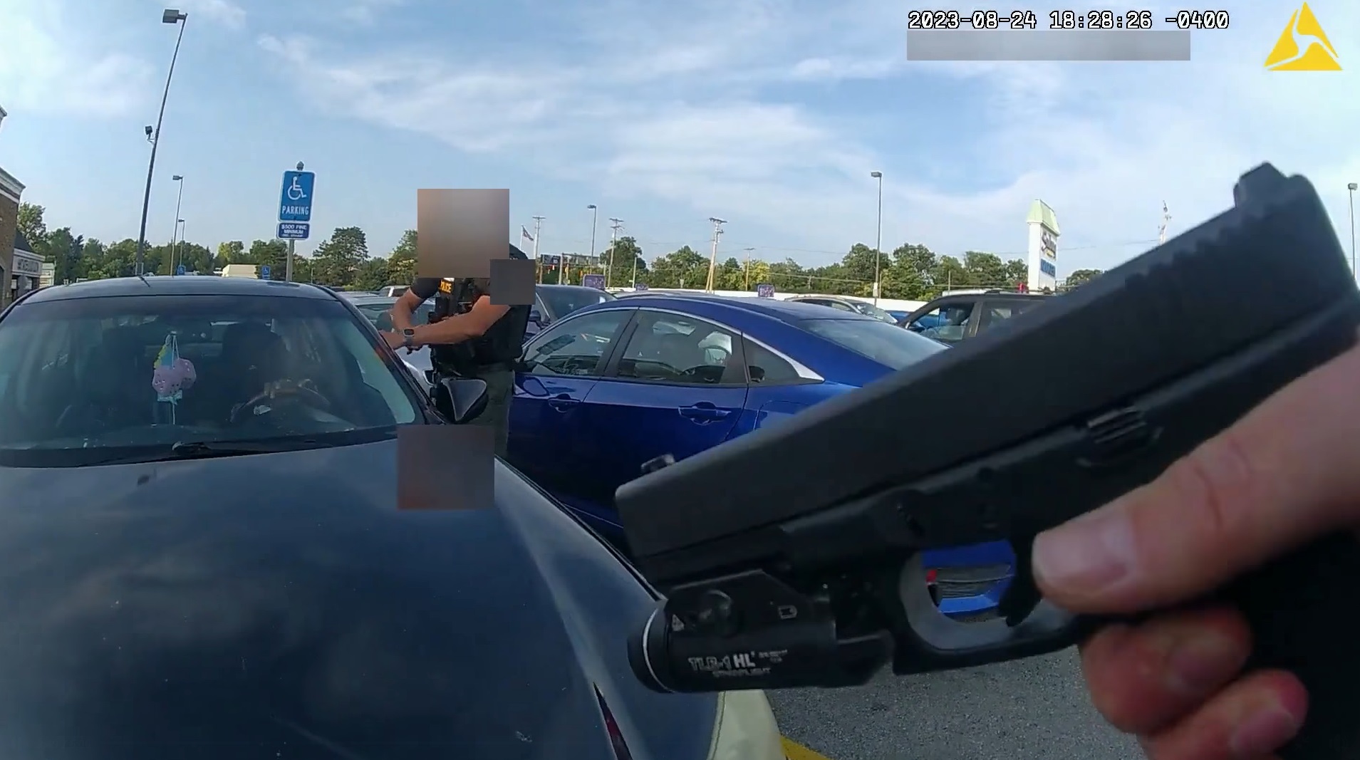 În acel moment, ofiţerul amplasat în faţa maşinii îndreaptă pistolul spre tânără în timp ce urlă la ea să iasă din maşină.
