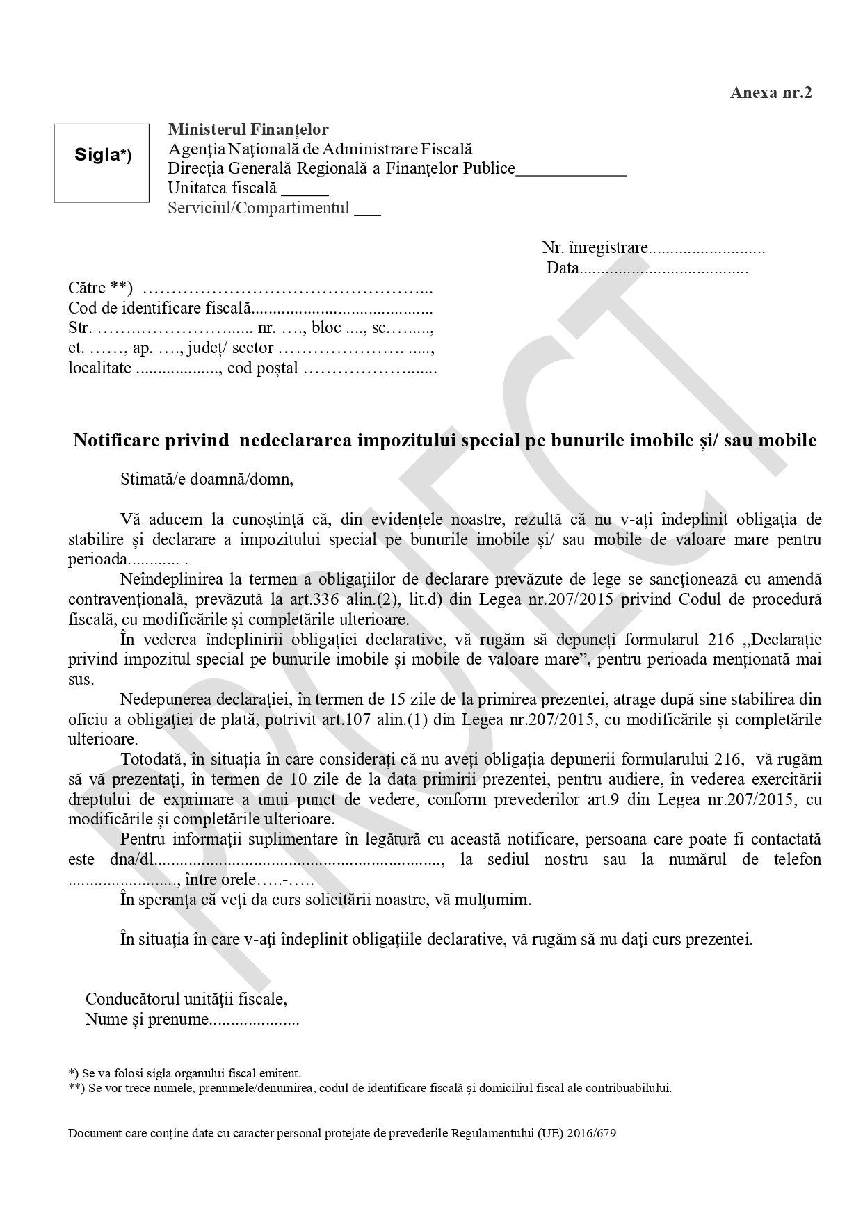 Anexa 2 – Notificare privind nedeclararea impozitului special pe bunurile imobile și/ sau mobile: