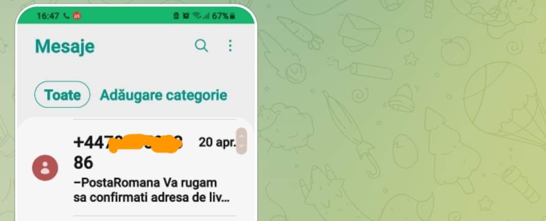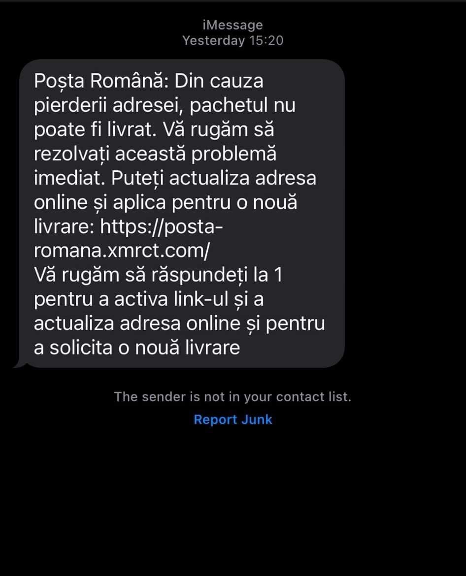 - De pe un număr de telefon de România trimit un SMS prin care destinatarului i se aduce la cunoștință faptul că trebuie să primească un colet, dar adresa este incorectă;