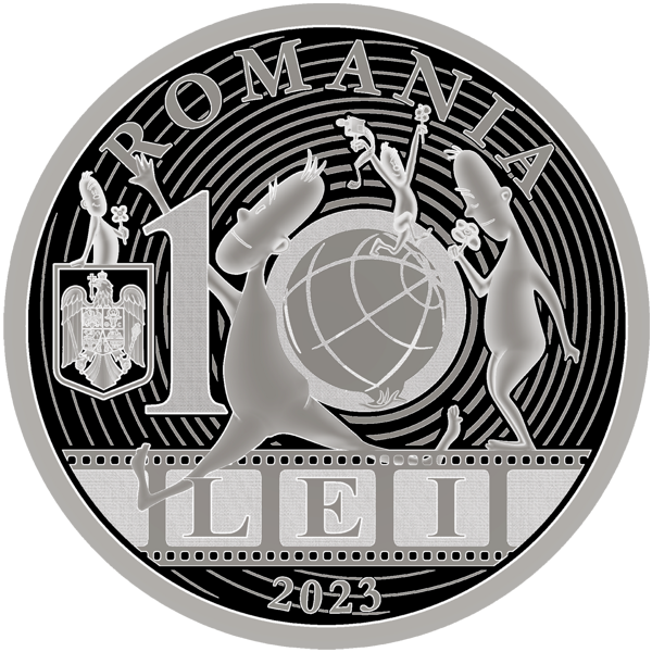 Aversul monedei redă personajul de animaţie creat de Ion Popescu-Gopo (Omuleţul) reprezentat în mai multe ipostaze, alături de globul pământesc şi o peliculă de film, inscripţia “ROMANIA” în arc de cerc, stema României, valoarea nominală “10 LEI” şi anul de emisiune “2023”.