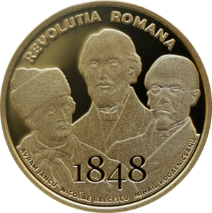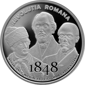 - Pe reversul comun al monedelor se prezintă portretele și numele revoluționarilor pașoptiști Avram Iancu, Nicolae Bălcescu și Mihail Kogălniceanu și inscripțiile „REVOLUTIA ROMANA” și „1848”.