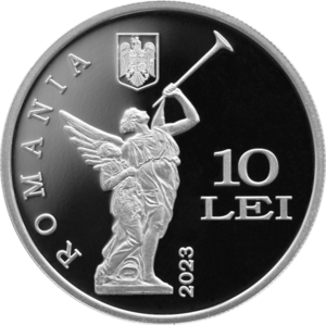 - Pe aversul monedei de argint se redă monumentul Eroilor Pompieri din București, stema României, inscripția „ROMANIA” în arc de cerc, valoarea nominală „10 LEI” și anul de emisiune „2023”.