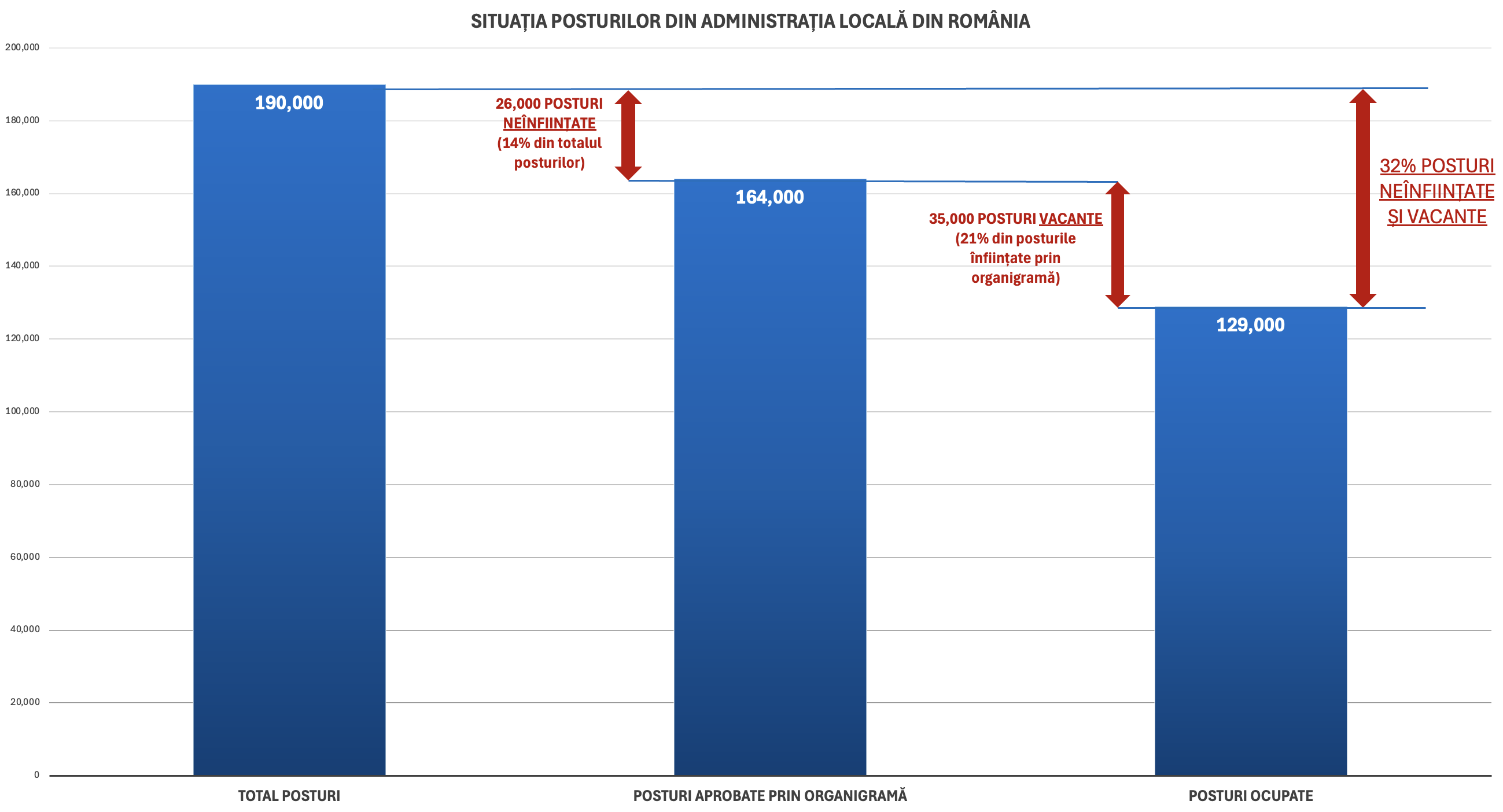 Astfel, în România, numărul maxim de posturi aprobate este de aproximativ 190.000. Prin organigrame, la nivelul autorităților locale, au fost aprobate 164.000 de posturi. Dintre acestea, 129.000 de posturi sunt efectiv ocupate, restul fiind vacante.