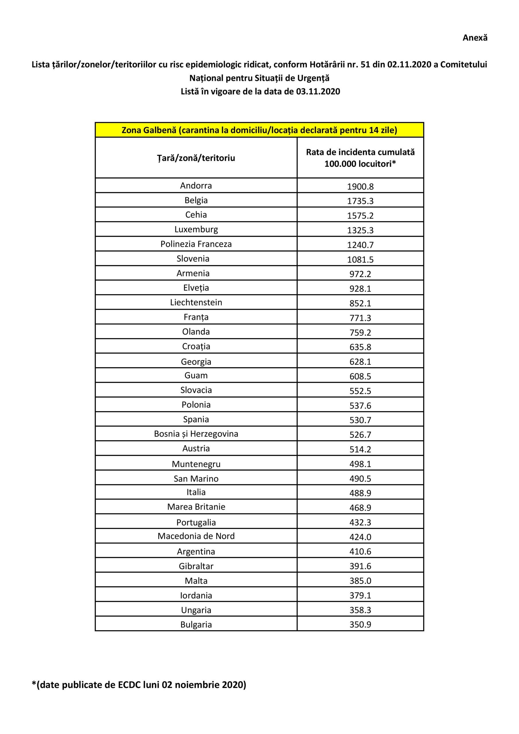 Față de lista aprobată în 26 octombrie, printre nou intratele în zona galbenă se află Ungaria, Austria, Bulgaria și Italia. Vezi mai jos lista completă și incidența înregistrată în fiecare țară în parte: