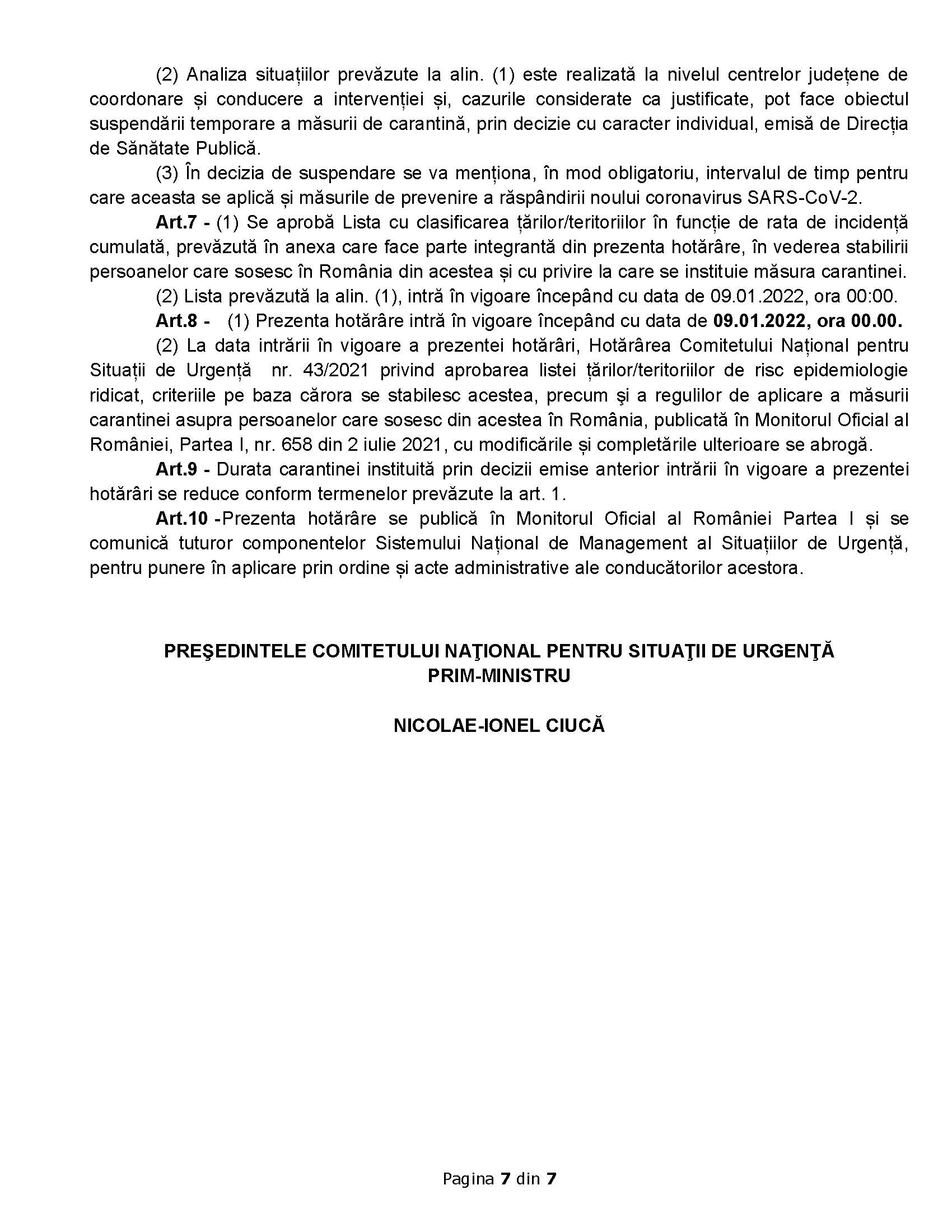 Hotărârea introduce măsura carantinei cu privire la contacții direcți ai persoanelor confirmate pentru infecția cu virusul SARS-CoV-2, cu durata de 5 zile pentru persoanele vaccinate sau trecute prin boală în ultimele 180 de zile, respectiv 10 zile pentru persoanele nevaccinate și care nu au trecut prin boală în ultimele 180 de zile.