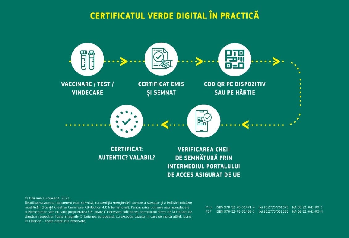 Adeverința electronică verde va constitui dovada că deținătorul a fost vaccinat împotriva COVID-19, a primit un rezultat negativ la testul de depistare a infecției cu virusul SARS-CoV-2 sau s-a vindecat de COVID-19.