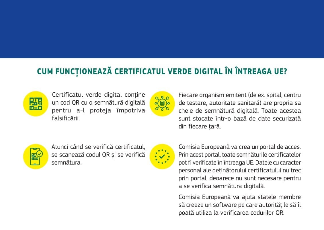 Adeverințele vor include un set limitat de informații, cum ar fi numele, data nașterii, data eliberării, informații relevante cu privire la vaccin/test/vindecare și un identificator unic al adeverinței. Aceste date pot fi verificate numai pentru a confirma și a verifica autenticitatea și valabilitatea adeverințelor.