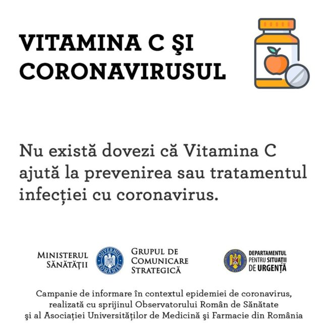 Specialiştii din domeniul medical informează că „Vitamina C este un micronutrient esențial pentru buna funcționare a organismului nostru. Doza zilnică necesară de vitamina C se obține printr-o alimentație echilibrată ce include fructe și legume. Studiile științifice arată că vitamina C poate reduce simptomele într-o răceală obișnuită și, în special la persoanele cu carență de vitamină C, poate avea efecte benefice în pneumonii. În prezent, nu există dovezi că vitamina C ajută a prevenirea sau tratamentul infecției cu coronavirus. Supradoza de vitamina C poate cauza reacții adverse precum greață, crampe abdominale și diaree.”