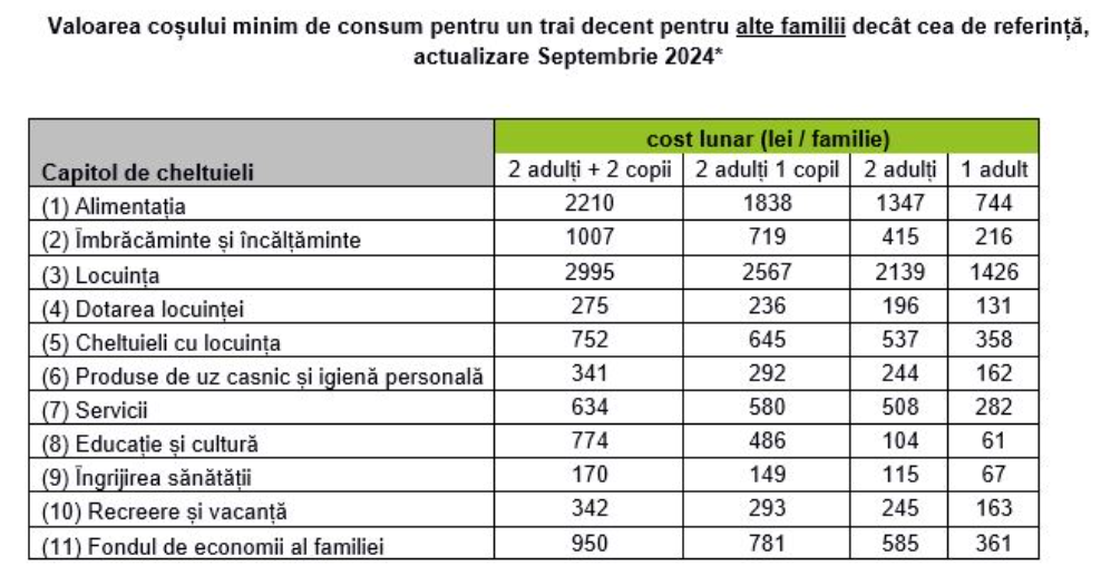 „Ideea unui coş minim de consum pentru un trai decent presupune alcătuirea unui set de cheltuieli periodice necesare pentru îndeplinirea unor nevoi de bază pentru o familie cu o structură dată. Pe lângă nevoile imediat necesare supravieţuirii – adăpost, alimentaţie – coşul minim pentru un trai decent acoperă o serie cuprinzătoare de nevoi curente cum ar fi îmbrăcămintea, igiena personală, educaţia, îngrijirea sănătăţii, transportul, comunicaţiile, recreerea, precum şi eventualele cheltuieli neprevăzute (evenimente familiale, probleme de sănătate etc.)”, se arată în comunicat.