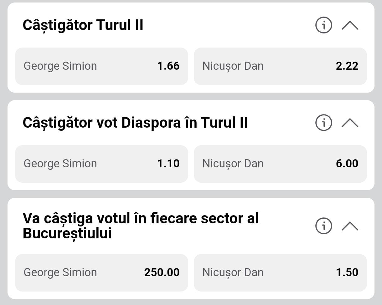 Pe piețele de pariere obișnuite sunt discutați câștigătorul turului 2, câștigătorul turului 2 în diaspora sau un eventual candidat care să câștige toate cele șase sectoare ale Bucureștiului.