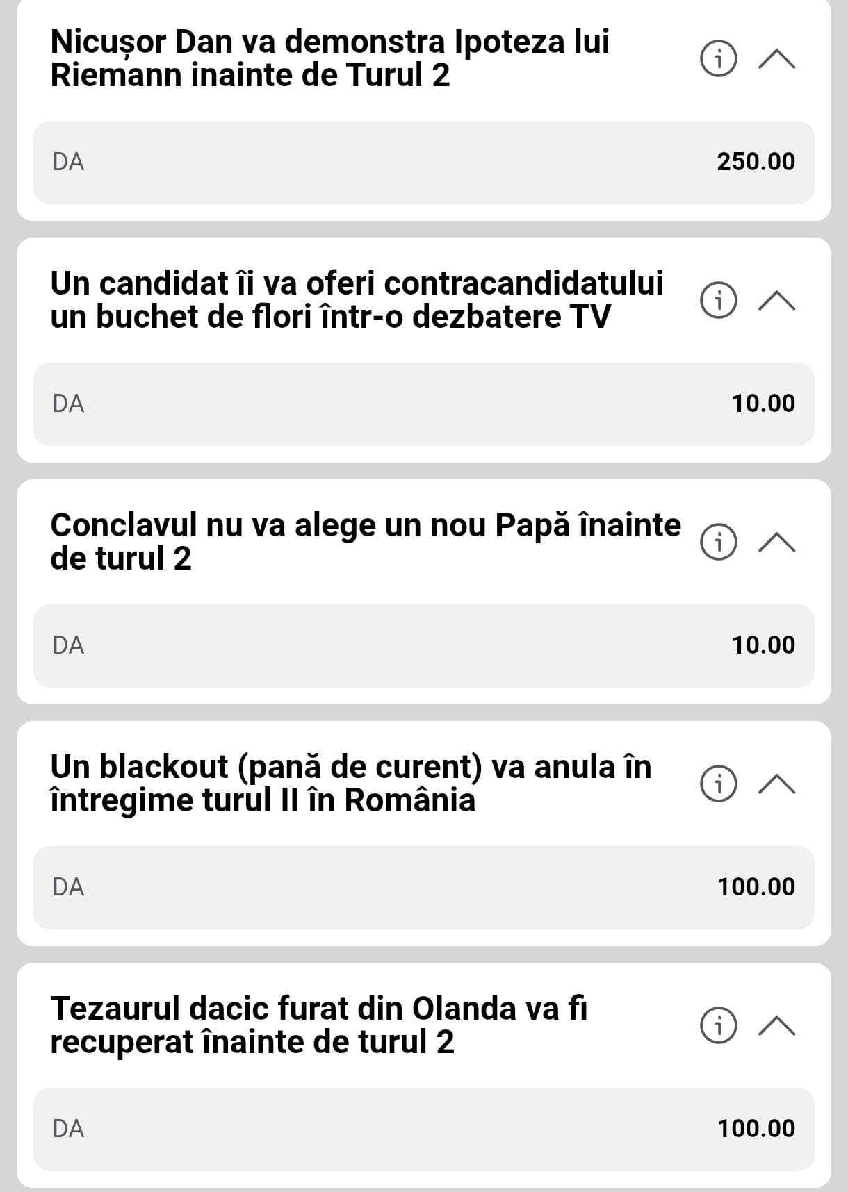 În continuare, agenția în cauză prezintă și câteva piețe de pariere mai inedite. Pentru ca Nicușor Dan să demonstreze ipoteza lui Riemann – una dintre cele mai importante probleme matematice încă nerezolvate – înainte de turul 2 oferă o cotă de 250.