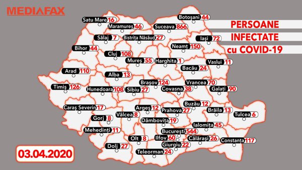 Potrivit datelor oferite de Grupul de Comunicare Strategică, în data de 3 aprilie, situaţia din România arată în felul următor: cea mai afectată zonă este, în continuare, Suceava, cu 866 cazuri. Bucureşti are 544 cazuri, Neamţ – 150 de cazuri, Constanţa – 117 cazuri şi Arad – 110 cazuri.