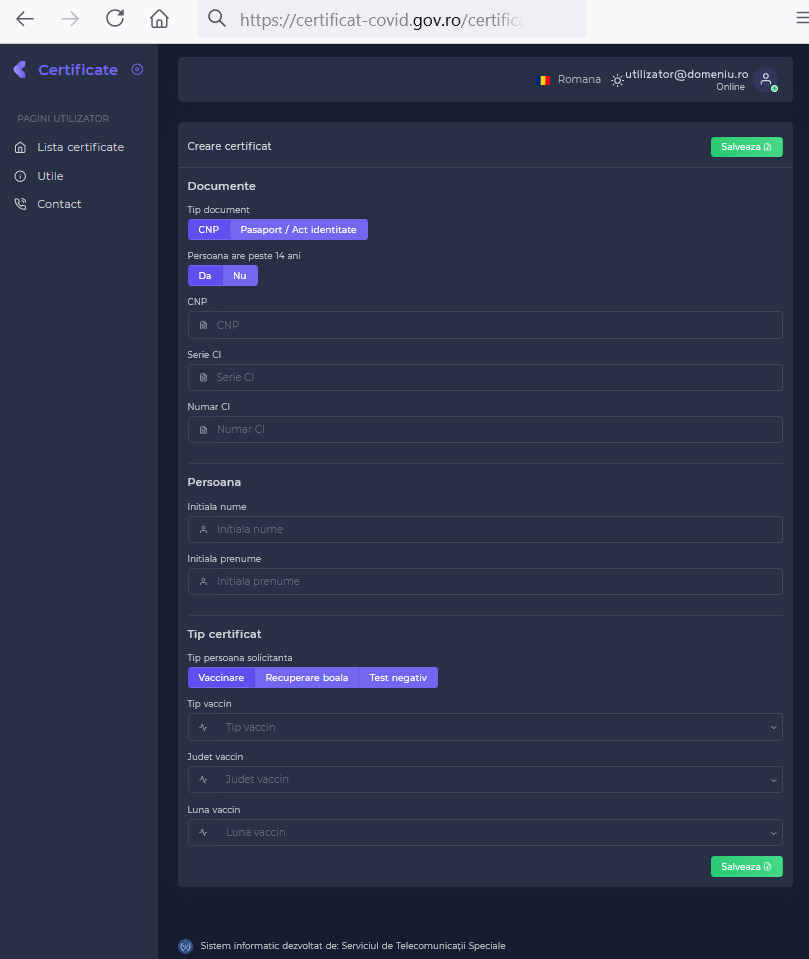 BUCUREȘTI. Potrivit STS, cei care vor dori un certificat pentru a călători în siguranță pe timpul pandemiei de COVID-19 vor avea la dispoziție, începând de joi, platforma https://certificat-covid.gov.ro. Interfața aplicației este intuitivă, iar în mai puțin de 10 pași, poate fi obținut certificatul.