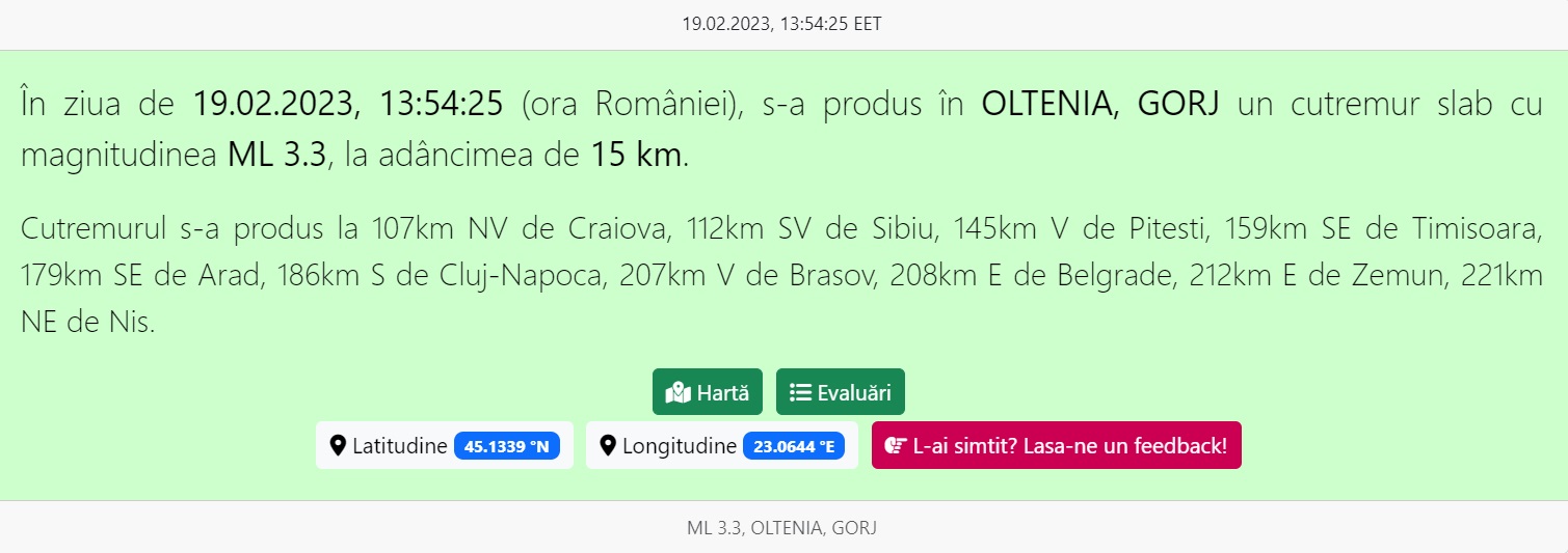 Conform datelor publicate de INCDFP vineri, din momentul producerii cutremurului cu magnitudine de 5,7 pe scara Richter (ML), din data de 14 februarie 2023, până în 17 februarie, au avut loc trei replici semnificative cu magnitudine mai mare de 4 grade, respectiv: 4,1 grade (pe 14 februarie 2023, la ora 17:24), la adâncimea de 3,6 km, 4,2 grade (în data de 16 februarie 2023, la ora 3:07, la adâncimea de 10,8 km) şi 4,3 grade (pe data de 17 februarie, la ora 11:11, la adâncimea de 8,7 km).