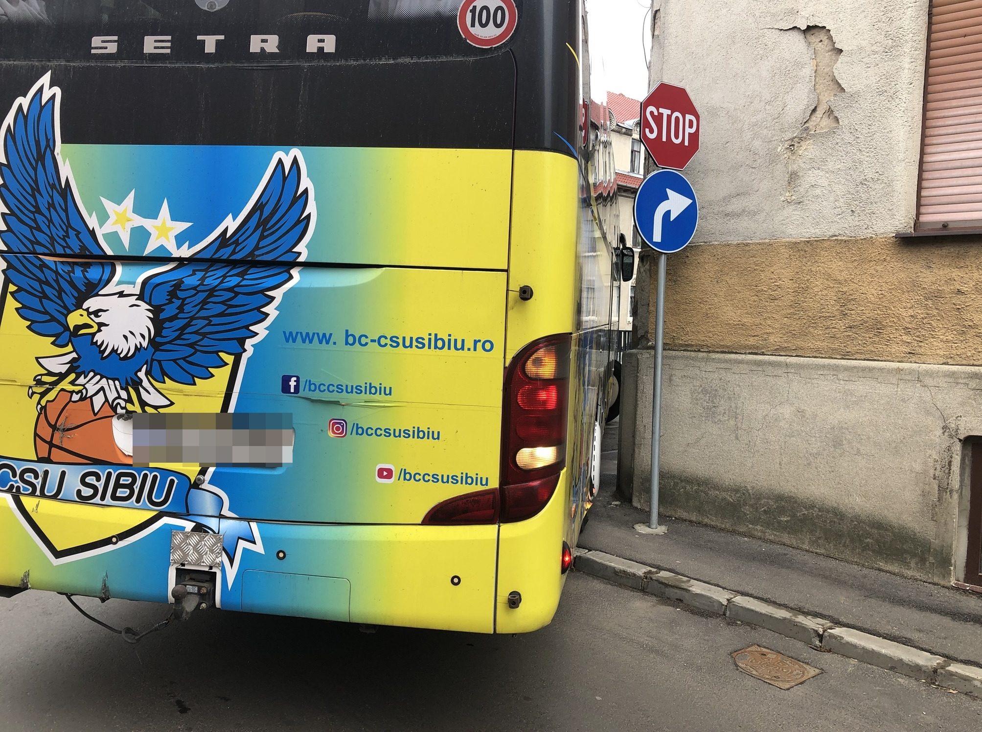 Autocarul aparține echipei de baschet BC CSU Sibiu, care a susținut un meci de baschet la Oradea împotriva „leilor roșii”.