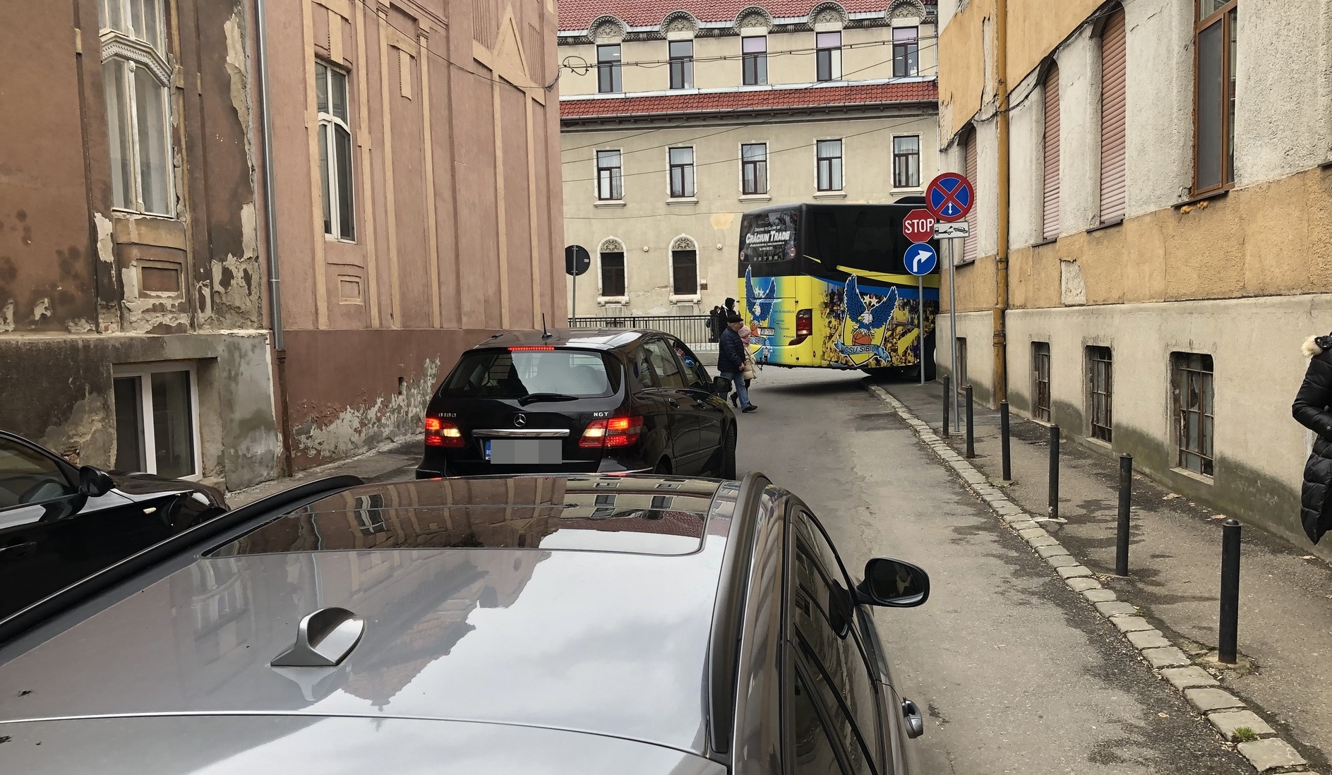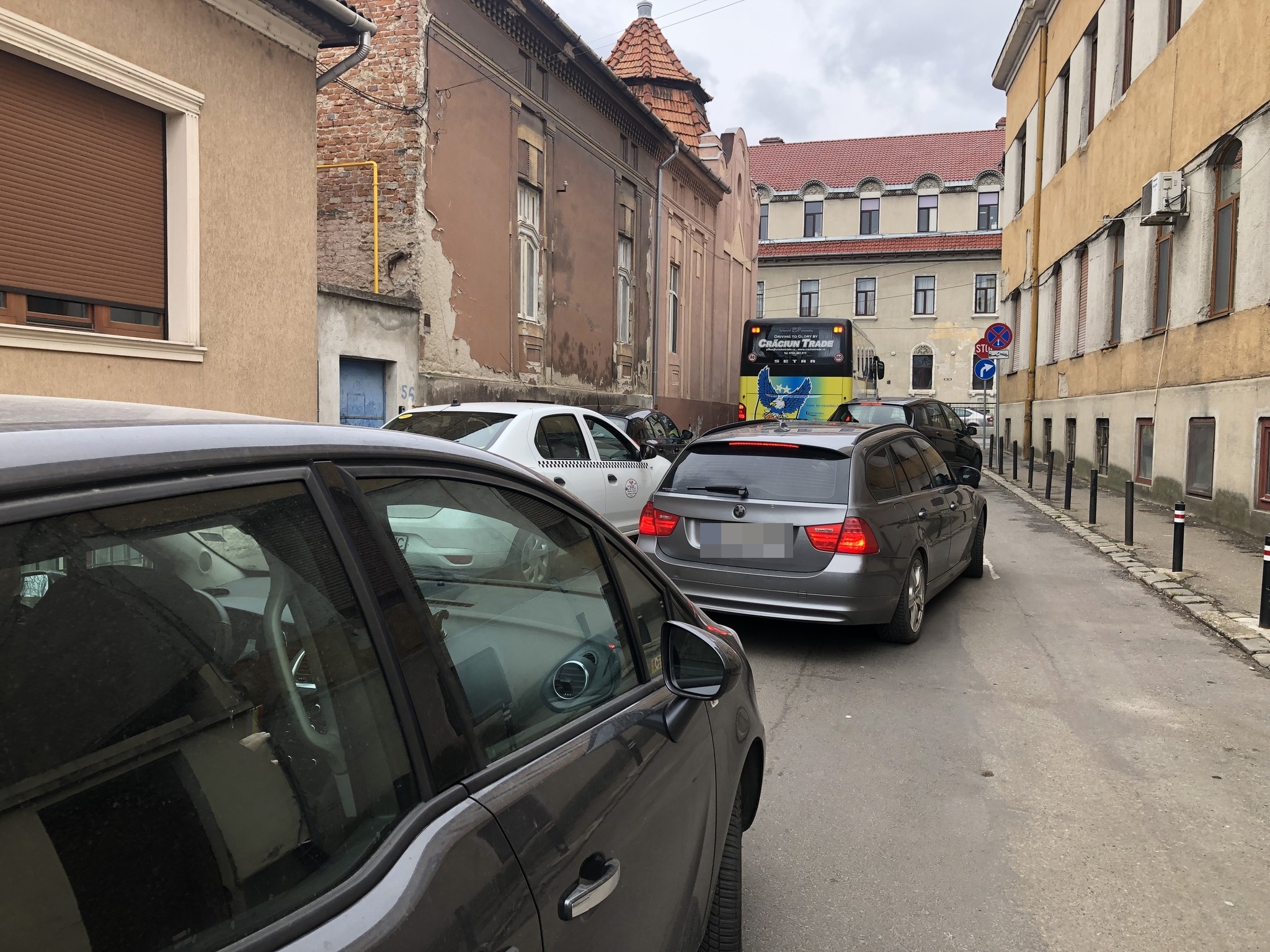 În pozele apărute pe grupul de facebook Oradea se vede cum șoferul autocarului a trecut milimetric pe lângă zidurile caselor din zonă, din mai multe manevre.