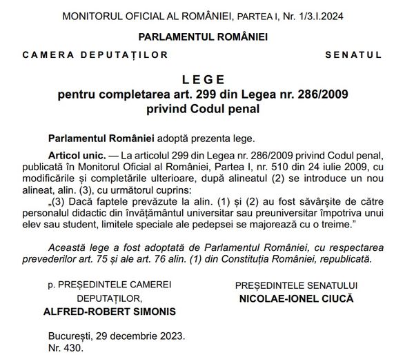 Prevederile sunt cuprinse într-o nouă lege – 430/2023 – publicată miercuri în Monitorul Oficial și care incriminează în mod expres fapta profesorilor care iau mită sub formă de favoruri sexuale.