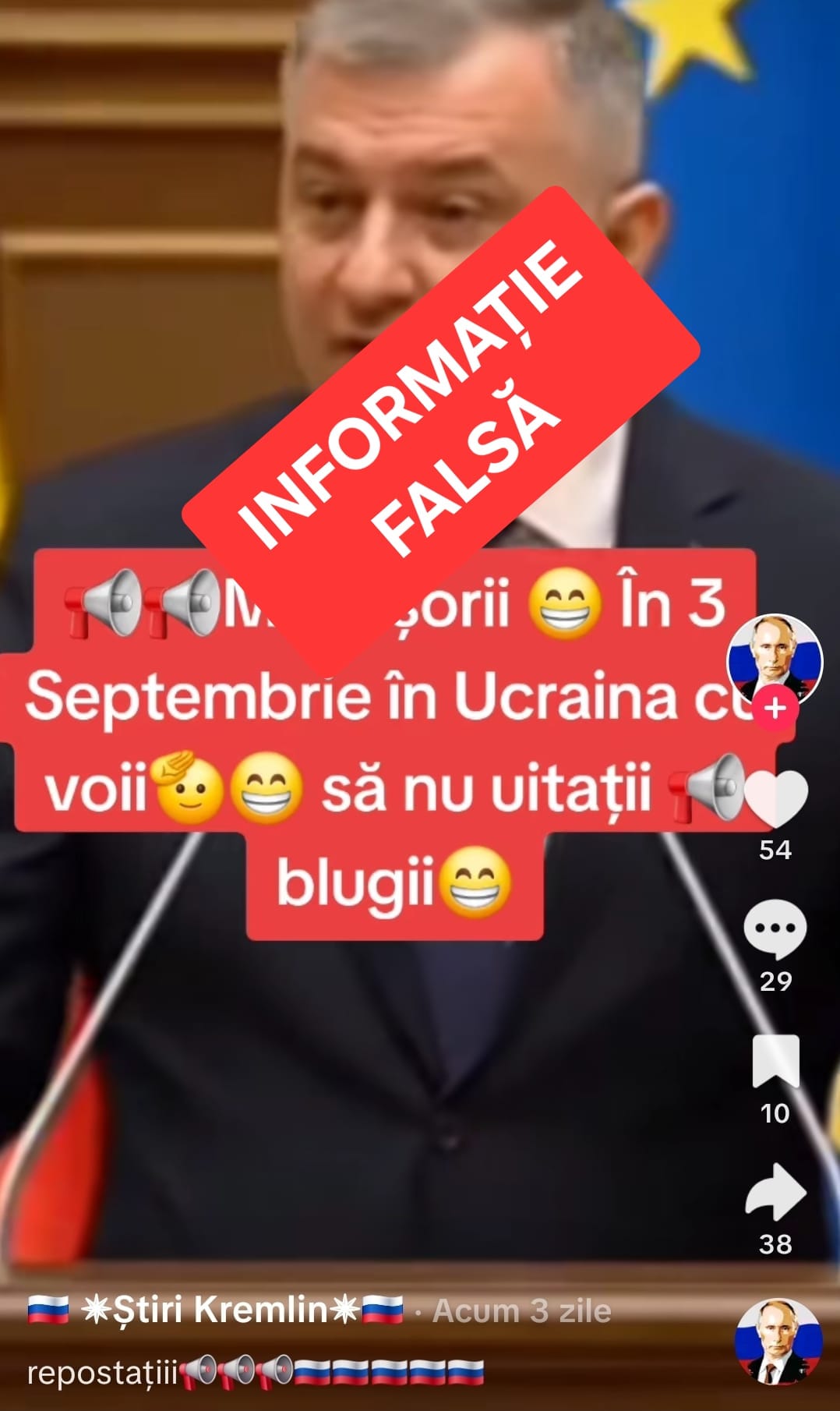 „Aceste clipuri sunt false și fac parte dintr-o acțiune de manipulare intenționată a opiniei publice. Prim-ministrul României nu a susținut astfel de declarații, iar România nu intră în război”, a informat, marți, Biroul de presă al MAI.