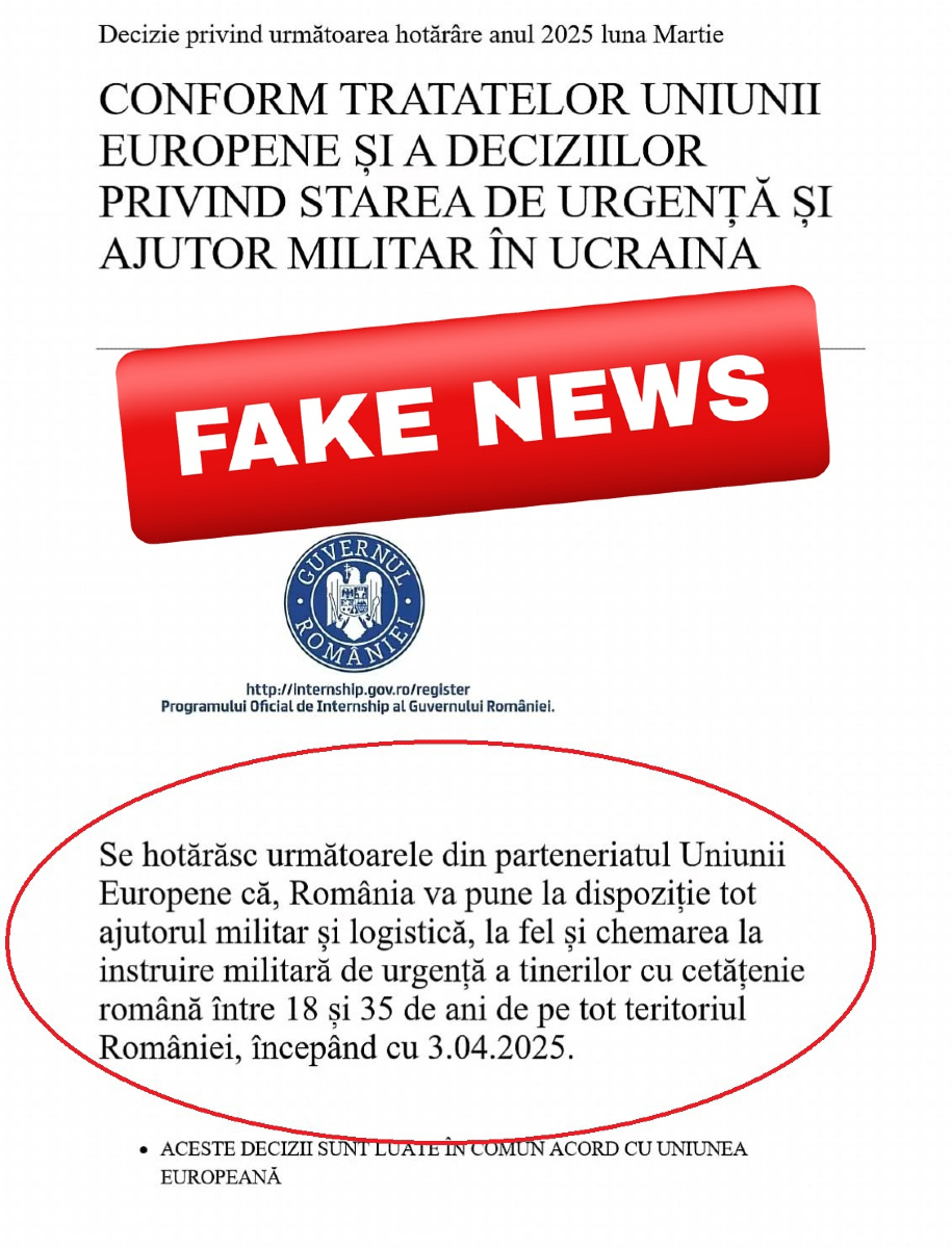 Prima dintre aceste dezinformări semnalează ‘chemarea la instruire militară de urgență a tinerilor cu cetățenie română între 18 și 35 de ani (sic!) de pe tot teritoriul României, începând cu 3 aprilie 2025’.