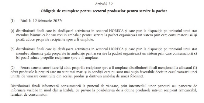 Regulamentul (UE) 40/2025 privind ambalajele și deșeurile de ambalaje impune ca, până la 12 februarie 2027, operatorii din domeniul HoReCa să organizeze un sistem prin care consumatorii să poată aduce propriile recipiente pentru a le umple cu produse alimentare sau băuturi. Aceste măsuri sunt menite să reducă semnificativ deșeurile generate de ambalajele de unică folosință, care reprezintă o problemă ecologică majoră.