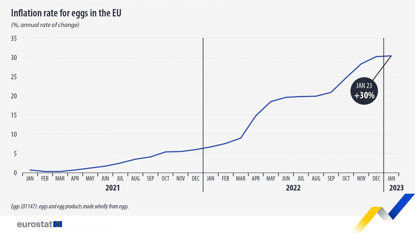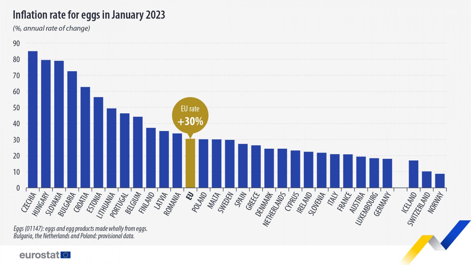 În rândul statelor membre, cele mai mari creşteri de preţuri la ouă s-au înregistrat în Cehia (cu un avans de 85% în luna ianuarie 2023 comparativ cu luna ianuarie 2022), urmată de Ungaria (80%) şi Slovacia (79%). Cele mai mici creşteri au fost înregistrate în Germania şi Luxemburg (ambele cu 18%) şi Austria (19%).