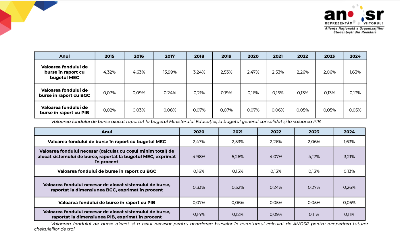 • „sistemul de burse a fost constant subfinanțat prin raportare la coșul minim de trai al unui student, calculat fie de CNFIS, fie de ANOSR, fondul alocat în 2024 fiind cu aproape jumătate mai redus față de fondul necesar pentru a acorda același număr de burse în cuantumul minim de 1.588 lei/lună