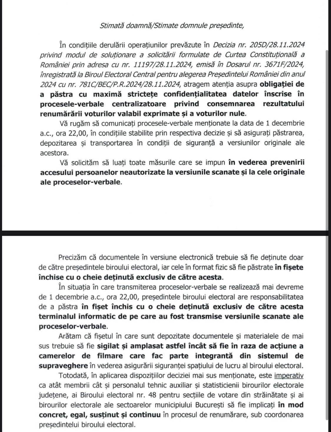 „În condițiile desfășurării operațiunilor (…) atragem atenția asupra obligației de a păstra cu maximă strictețe confidențialitatea datelor înscrise în procesele-verbale centralizatoare privind consemnarea rezultatului renumărării voturilor valabil exprimate și a voturilor nule. (…) Vă solicităm să luați toate măsurile care se impun în vederea prevenirii accesului persoanelor neautorizate le versiunile scanate și cele originale ale proceselor verbale”, se arată în nota trimisă birourilor județene.