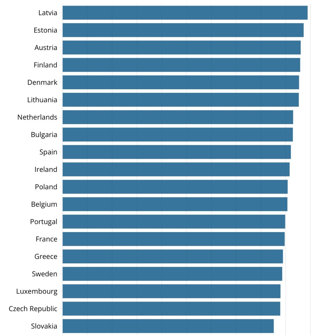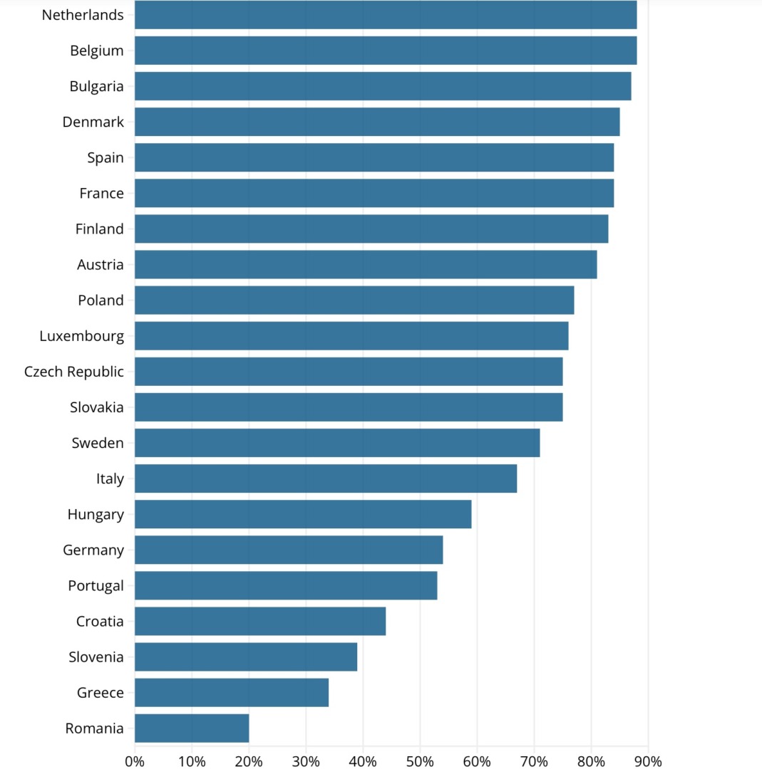 Imediat după Olanda a fost Belgia, tot cu 88%, iar Bulgaria, 87% a fost coborâtă ușor în clasament din cauza rezultatelor sale din anii anteriori.
