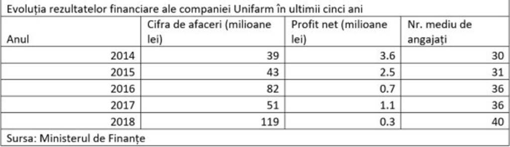 Unifarm a avut o cifră de afaceri de 119 milioane de lei în 2018, de peste două ori mai mare decât în 2017, arată datele de pe site-ul Ministerului de Finanţe. Compania a înregistrat în 2018, cel mai recent an pentru care există date disponibile, un profit de circa 300.000 de lei, de patru ori mai mic decât în anul anterior. Compania are 40 de angajaţi.