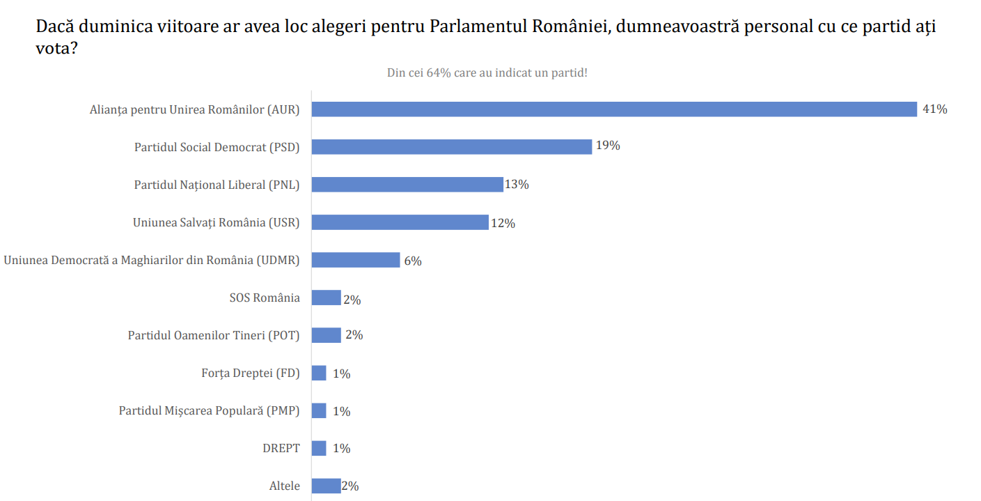 Potrivit datelor, AUR ar obține 41% din voturi dacă alegerile parlamentare ar avea loc duminică. Pe locurile următoare s-ar clasa PSD, cu 19%, PNL cu 13%, USR cu 12% și UDMR cu 6%.