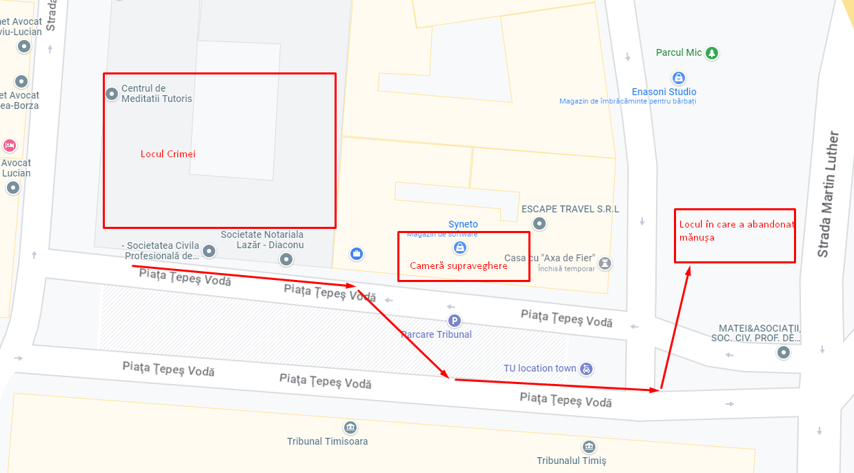 A fugit de la fața locului prin Piața Țepeș Vodă, prin dreptul clădirii de la numărul 1, iar apoi a traversat strada spre intrarea din spate a Palatului Dicasterial. A cotit apoi spre stânga și a abandonat una dintre mănușile pe care le purta, plină de sânge, sub una dintre băncile din părculețul pentru copii de la intersecția străzii George Coșbuc cu Piața Țepeș Vodă.