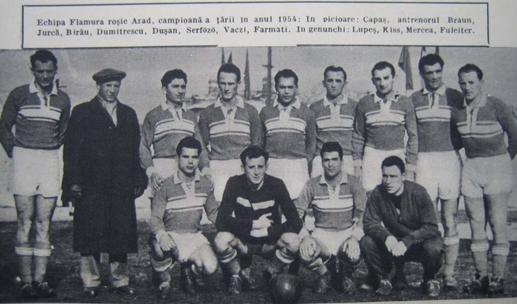Două mii de arădeni însoțiseră echipa la Timișoara și aplaudau, împreună cu întreg stadionul, succesul textiliștilor. ”Pe teren, fotbaliștii se felicită și apoi, toți laolaltă, se îndreaptă spre antrenorul lor, Coloman Braun, și într-un gest de o frumoasă recunoștință, îl ridică în brațe ovaționându-l. Seara, pe șoseaua care leagă Timișoara de Arad, era o animație deosebită. Zeci de mașini poartă spre casă pe suporterii Flamurei Roșii. Printre ele un autobuz galben-roș, în care cântecul și veselia nu contenesc. Aici sunt campionii”, scriu Eftimie Ionescu și Petre Gațu în reportajul din revista Stadion din decembrie 1954. Cei doi gazetari îl surprind pe antrenor contemplându-și băieții: ”Când te gândești că acești jucători, cu toate lipsurile lor, au luptat cu atâta voință și dragoste pentru victoria finală… Merită această satisfacție!”