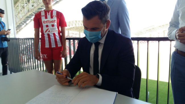 De la bun început s-a făcut un desfășurător, cu vizitarea tribunei I, la toate nivelurile, la demisol fiind vizitate chiar și vestiarele. La etajul 2, Ionuț Stroe a semnat în cartea de onoare, alături de principalii politicieni arădeni. Apoi, ministrul Stroe a spus: „Este un stadion cu care ne mândrim, alături de celelalte care sunt făcute din resurse ale administrației publice centrale. Subliniez și mulțumesc domnule europarlamentar, fost primar, dragi colegi din zona administrației locale, aici a fost efortul exclusiv al autorităților locale. Trebuie menționat acest lucru, deoarece dacă alții au beneficiat de unele investiții publice, a Companiei Naționale de Investiții, iată că aici, cu resursele proprii, se poate. UTA este un club, o legendă, mult așteptată, nu numai de noi, acolo unde îi este locul, în înalta performanță. Este așteptată de tot ce înseamnă mișcarea sportivă, acolo unde îi este locul. Mă bucur, apreciez și salut prezența și revenirea UTA-ei în prima ligă fotbalistică. Din punctul meu de vedere, este locul unde marile orașe ale acestei țări, cu echipele care au scris istorie în fotbalul românesc, trebuie să revină. Și, nu în ultimul rând, pe lângă performanța sportivă, sau cea administrativă, trebuie să aducem aceste stadioane în circuitul marilor competiții. Pentru că, într-adevăr, le oferi locul potrivit, te folosești de ele, le pui în valoare, le rentabilizezi din punct de vedere economic și sportiv doar dacă pe ele organizezi mari competiții. Aici, Aradul se poate înscrie cu această arenă, în circuitul competițiilor interne și internaționale, care să genereze interes și beneficii sportive, dar și economice. Sunt extrem de onorat, mă bucur nespus de mult că m-ați invitat aici, eu vă doresc mult succes, sunt sigur că numai lucruri bune veți face pe acest stadion, UTA-ei îi urez numai rezultate bune, de ce să nu-și rotunjească acea cifră de campioană a Provinciei, ca și număr de trofee, prin viitoare performanțe. Sper să fie într-un ceas bun, să inaugurați stadionul cu un rezultat pozitiv și – de ce nu – pe viitor, să aveți rezultate pe măsura tradiției, iubirii și susținerii pe care comunitatea locală și nu numai o are” – a declarat Ionuț Stroe.